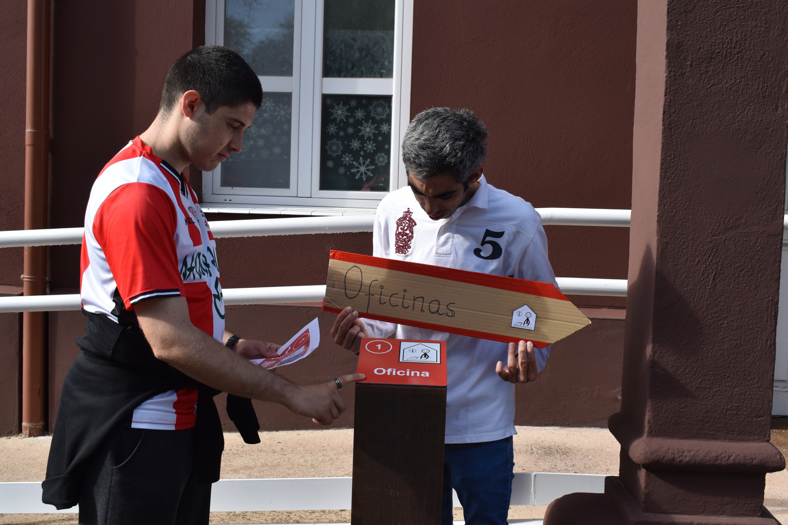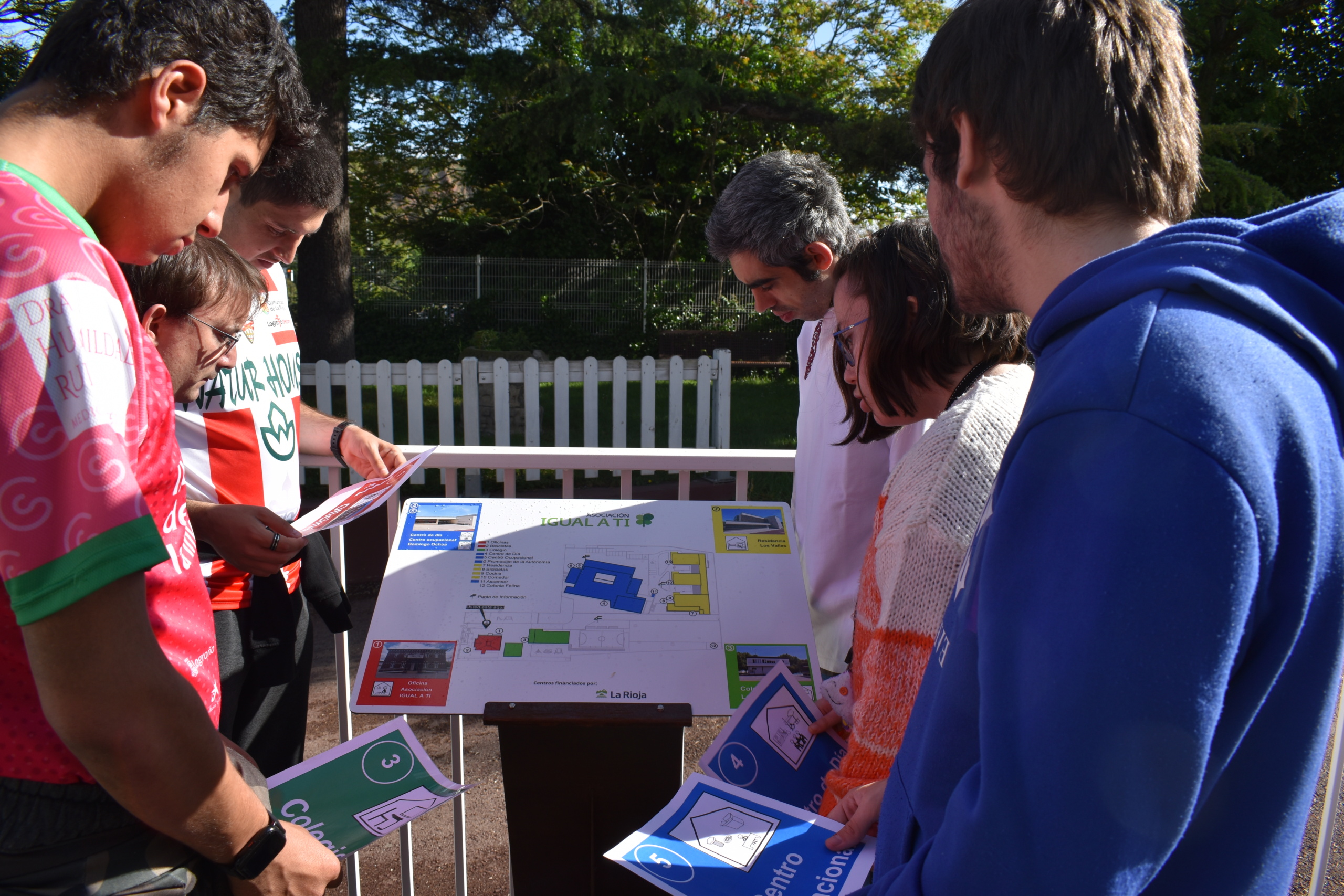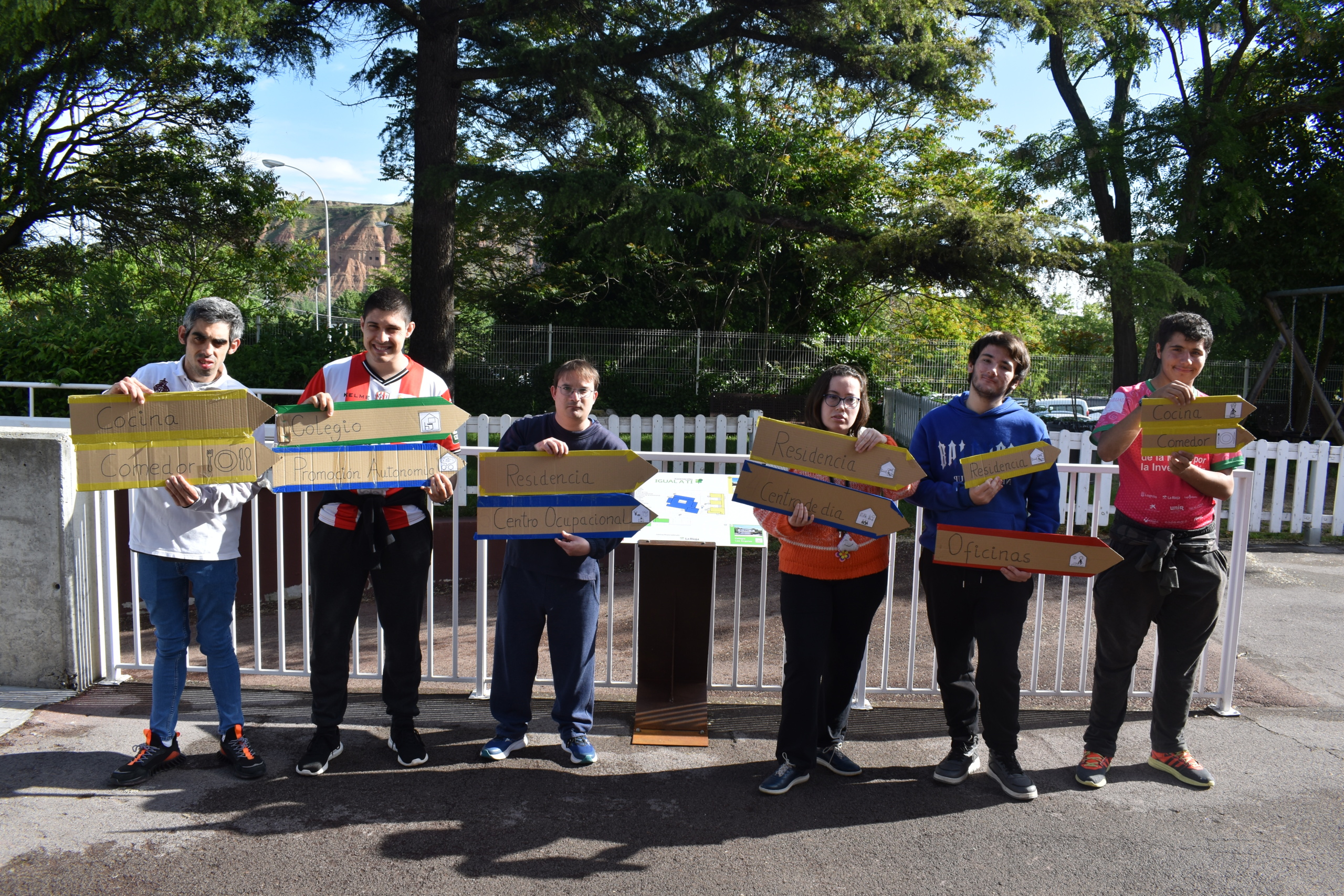 Una vez se obtuvieron los resultados de estas entrevistas, se llegó a la conclusión de que había edificios que eran más difíciles de encontrar si se accedía a las instalaciones desde la calle Luis de Ulloa o por Madre de Dios. Posteriormente, se hicieron varios bocetos, tomando como referencia la normativa en cuanto a señalética para identificar los centros. Se hizo en cartón toda la señalética, en varios formatos (poste, banderola y mesa interpretativa), y cada edificio se identificó con un cartel con el pictograma que lo representaba y su nombre. Cada una de las zonas de la asociación en Logroño está asociada a un color diferente.